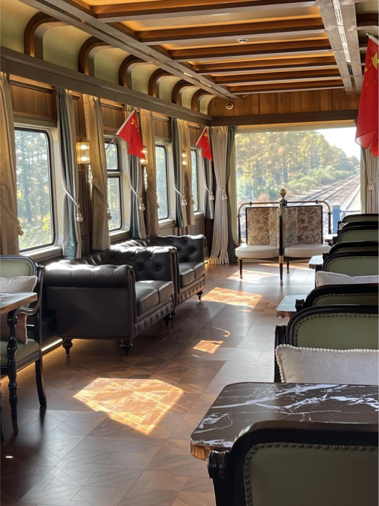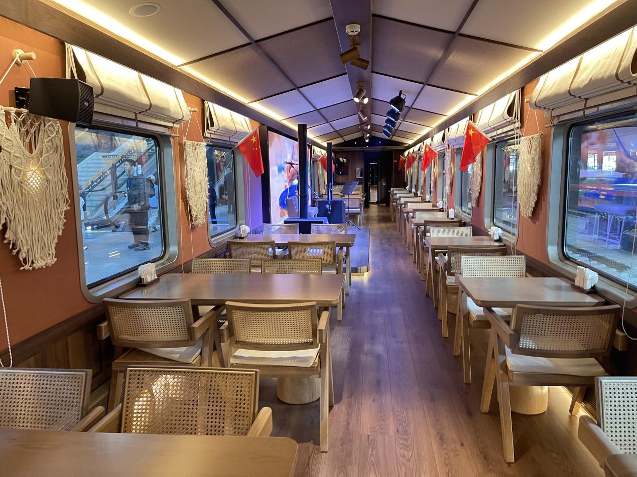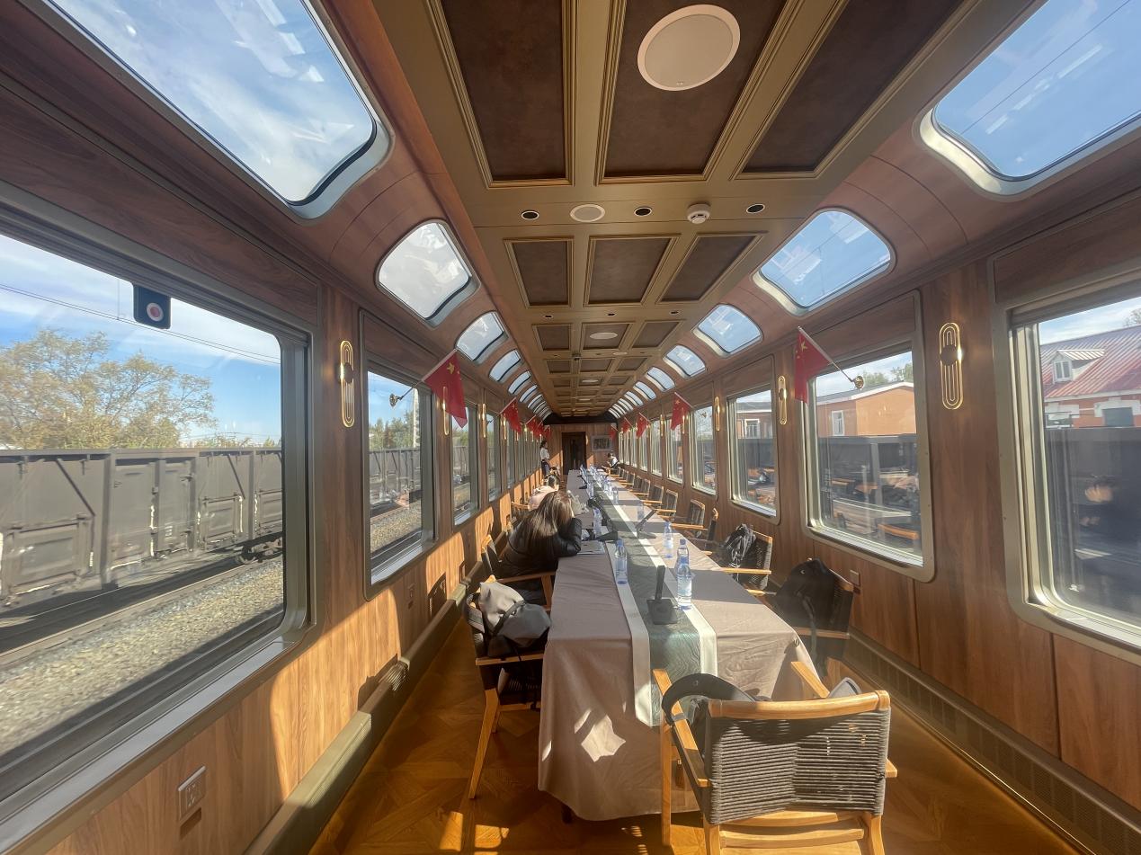 10月1日上午,哈爾濱站14站臺國旗飄揚、花團錦簇,在《伊人之春》、《我在黑龍江等你》等悅耳的音樂聲中,“伊春號”旅游列車首發(fā)儀式成功舉行,來自全國各地以及新加坡、泰國、臺灣等地的200余名中外游客齊聚冰城,開啟了“游千里畫廊,賞最美五花山”浪漫之旅。“伊春號”極具特色,外觀為輕奢復(fù)古風(fēng)格,車身主體顏色為深海藍和珍珠金,車頂?shù)陌咨怀鰜喍瑫┲黝},無論是行進在“綠水青山”,還是“冰天雪地”間,都極具辨識度。列車整列編組11輛,最大亮點是其觀光車的設(shè)計,其中有5輛休閑娛樂觀光車是根據(jù)“行走的敖麓古雅”“紅堡之夜”“金海岸漫步”“撒哈拉故事”“浪漫的溫哥華”五個大洲文化特色和建筑風(fēng)格設(shè)計;有2輛多功能觀光車首創(chuàng)全景式觀光車廂和懷舊式旅拍車尾,視野極為開闊,給游客們帶來全新的觀景體驗。